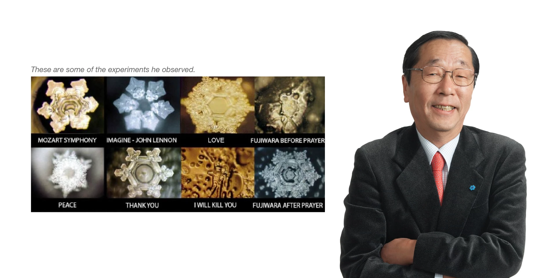 During the 1990s, Dr. Masaru Emoto conducted a series of experiments to observe the physical effect of words, sentences, music, and environment on the crystal structure of water. After observations, Dr. Emoto separated water into one hundred petri dishes and wrote different words, both positive and negative, and stuck them on containers filled with water.