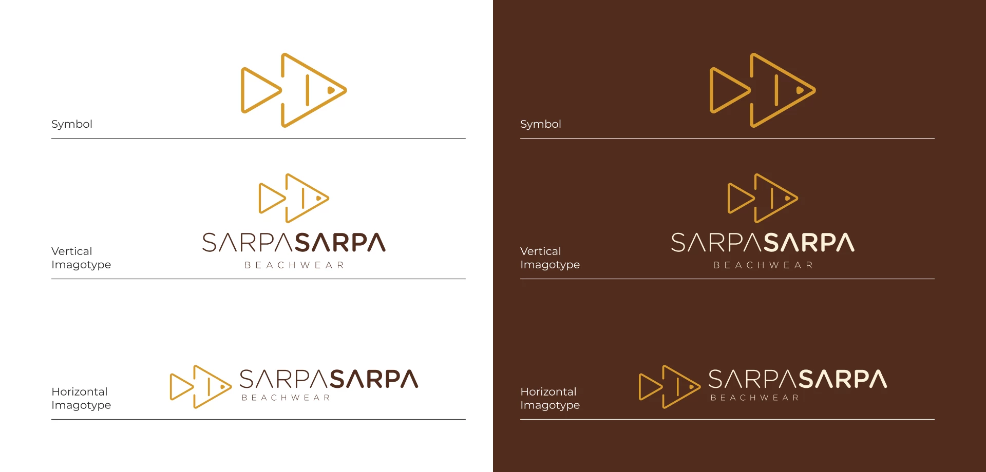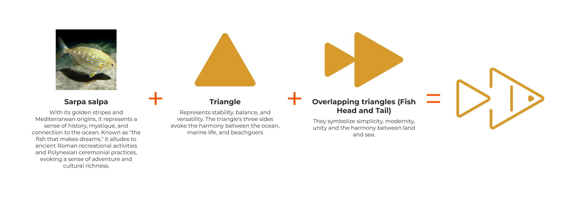 It combines geometric triangles to form a fish, symbolizing simplicity, modernity, harmony between land and sea, and the connection to ocean life, reflecting the brand’s contemporary and stylish identity.